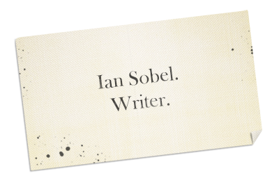 Name card with the name Ian Sobel, Writer, printed on it, with a cream-colored background and black ink splatters.